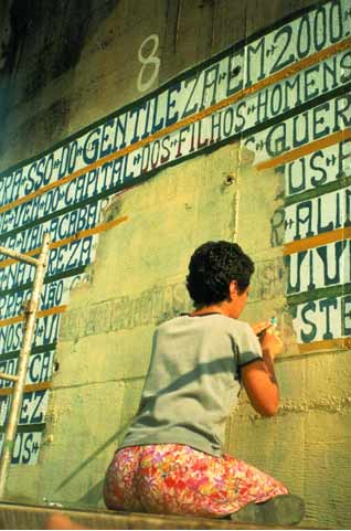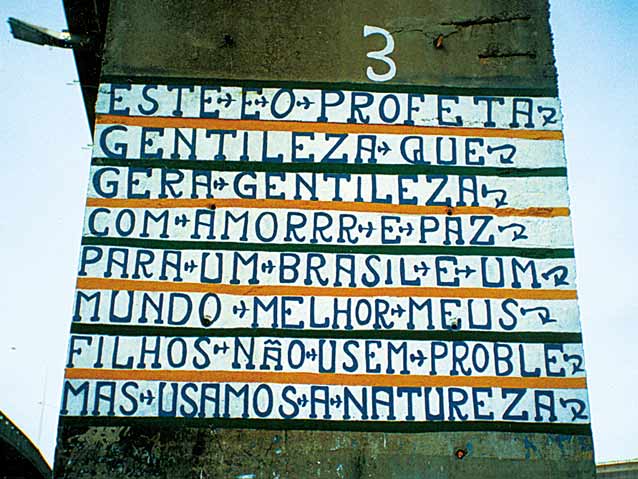 A partir desse gesto nasceu o Profeta Gentileza. Ele adotou roupas brancas, encurtou ou rompeu laços familiares, e começou a percorrer o Rio de Janeiro com estandartes, frases e um vocabulário próprio — mistura de crítica social, religiosidade popular e apelo moral. Não era um intelectual da academia; era um homem da rua que transformou a caligrafia em ação pública. Ele pintou mensagens por onde passou, mas o seu grande livro de pedra foi um trecho urbano específico: as pilastras do Viaduto do Gasômetro (Caju) — cerca de 56 pilastras que, pintadas em verde e amarelo, exibiam suas máximas, críticas ao que chamava de “capeta-capital” e apelos à bondade. Essas pinturas se tornaram, com o tempo, um ponto de referência simbólica — um manifesto escrito em concreto.